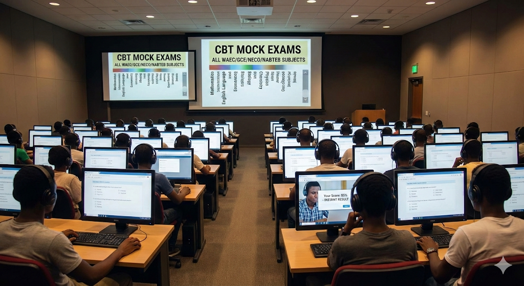 CBT MOCK EXAMS – WAEC/GCE/NECO/NABTEB Purpose: … CBT practice … Students answer questions … Students see scores instantly Subjects for CBT ALL WAEC/GCE/NECO/NABTEB SUBECTS 1. Mathematics 2. English Language 3. Economics 4. Government 5. Biology 6. Physics 7. Chemistry 8. Literature 9. CRS / IRS 10. Geography 11. Commerce 12. Accounting 13. Civic Education 14. Agricultural Science What to Do: 1. Click the Link 2. Select subject 3. Answer objective questions 4. Submit exam 5. See score immediately